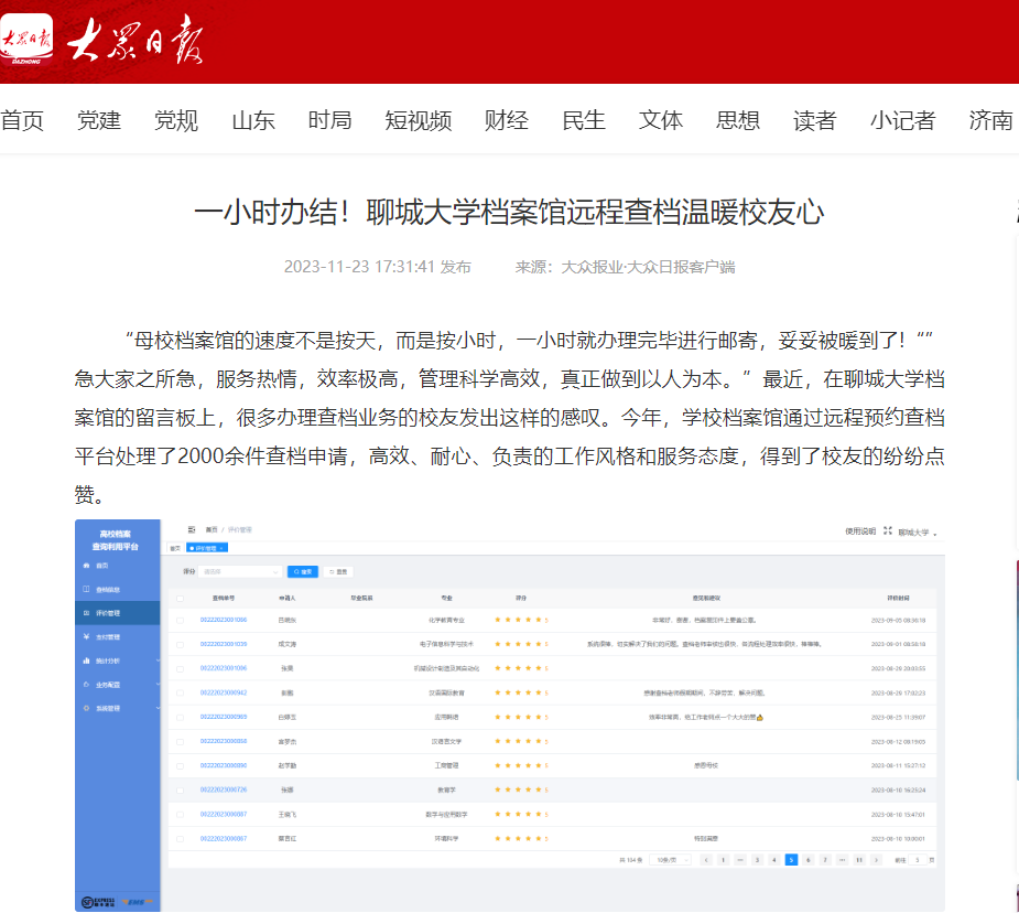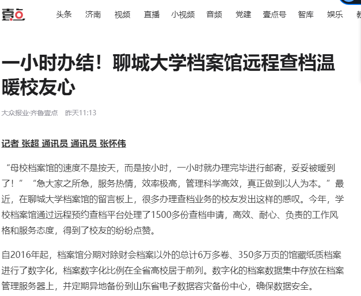 【數(shù)字聊大 智慧校園】【大眾日?qǐng)?bào)(客戶端)】【齊魯壹點(diǎn)】報(bào)道:一小時(shí)辦結(jié)!聊城大學(xué)檔案館遠(yuǎn)程查檔溫暖校友心