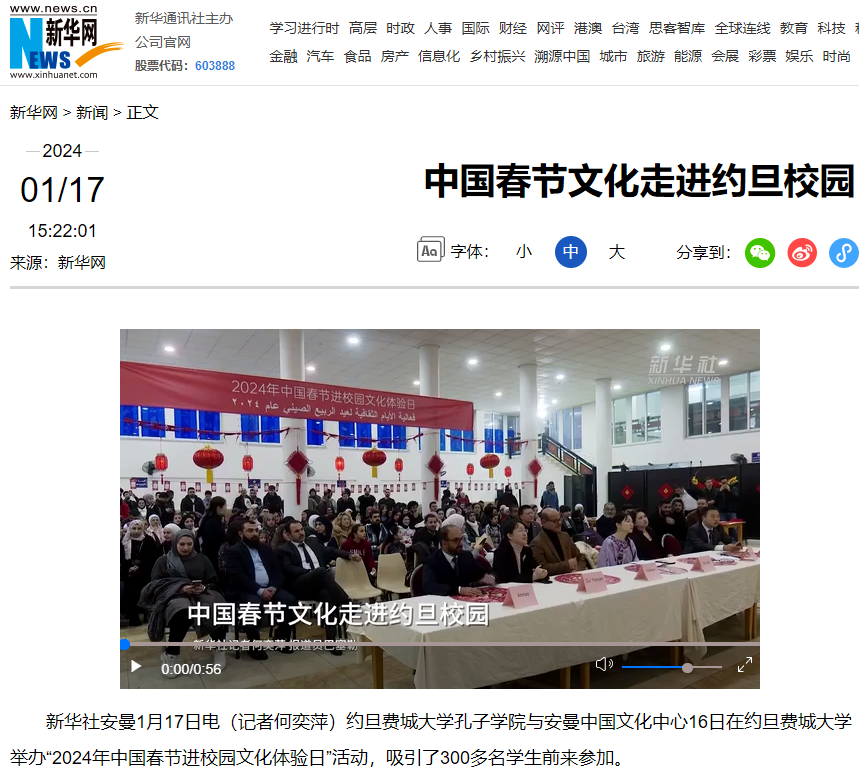 1月17日,央視、新華社報道聊城大學約旦孔子學院舉辦的春節文化活動。