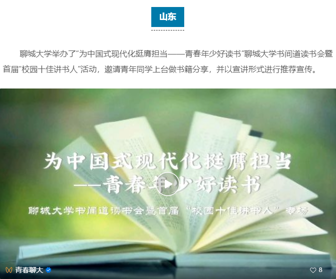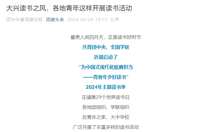 【編者按】4月24日,團中央基層建設部官微報道我校讀書季系列活動,展現我校在世界讀書日來臨之際開展“校園十佳講書人”活動的創新做法。