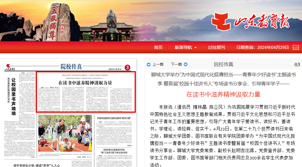 【編者按】4月29日,《山東教育報(bào)》以《聊城大學(xué)舉辦“為中國(guó)式現(xiàn)代化挺膺擔(dān)當(dāng)——青春年少好讀書(shū)”主題讀書(shū)季 暨首屆“校園十佳講書(shū)人”專(zhuān)場(chǎng)讀書(shū)分享會(huì),引導(dǎo)青年學(xué)子——在讀書(shū)中滋養(yǎng)精神汲取力量》為題,報(bào)道我校在世界讀書(shū)日到來(lái)之際開(kāi)展的讀書(shū)活動(dòng),成分展現(xiàn)我校良好的讀書(shū)氛圍和校園文明建設(shè)成果。