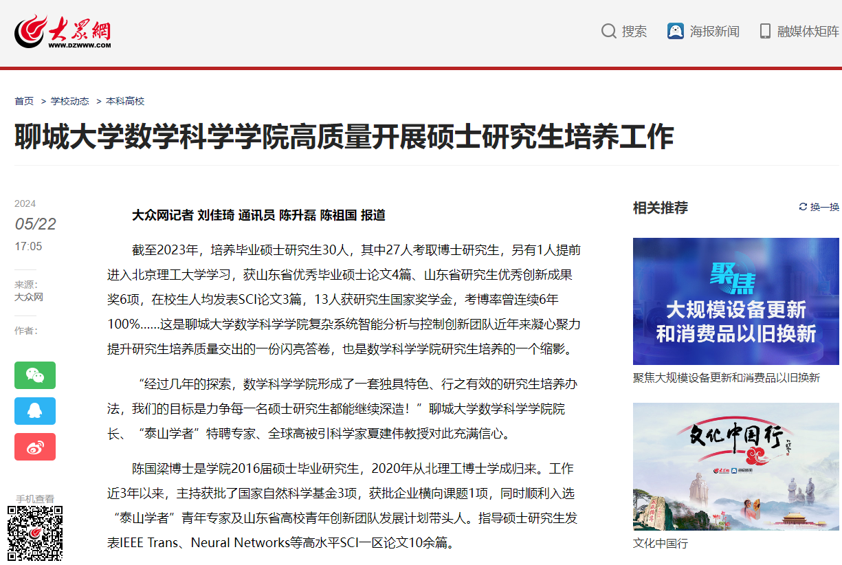 【編者按】5月22日,【大眾網(wǎng)】以《聊城大學(xué)數(shù)學(xué)科學(xué)學(xué)院高質(zhì)量開展碩士研究生培養(yǎng)工作》為題,報(bào)道該團(tuán)隊(duì)近年來碩士研究生培養(yǎng)成果。