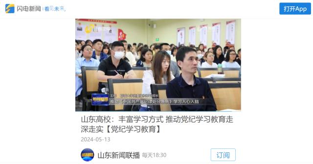 【編者按】5月13日,【山東新聞聯播】【山東衛視】【閃電新聞】以《山東高校:豐富學習形式 推動黨紀學習教育走深走實》為題,報道山東高校開展黨紀學習教育情況,視頻兩分十六秒報道我校開展黨紀學習教育做法。