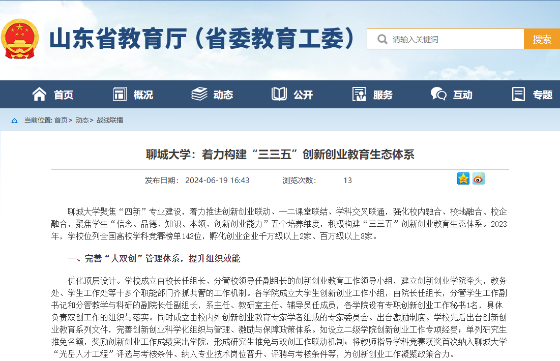【山東省教育廳(省教育工委)】發布聊城大學:著力構建“三三五”創新創業教育生態體系