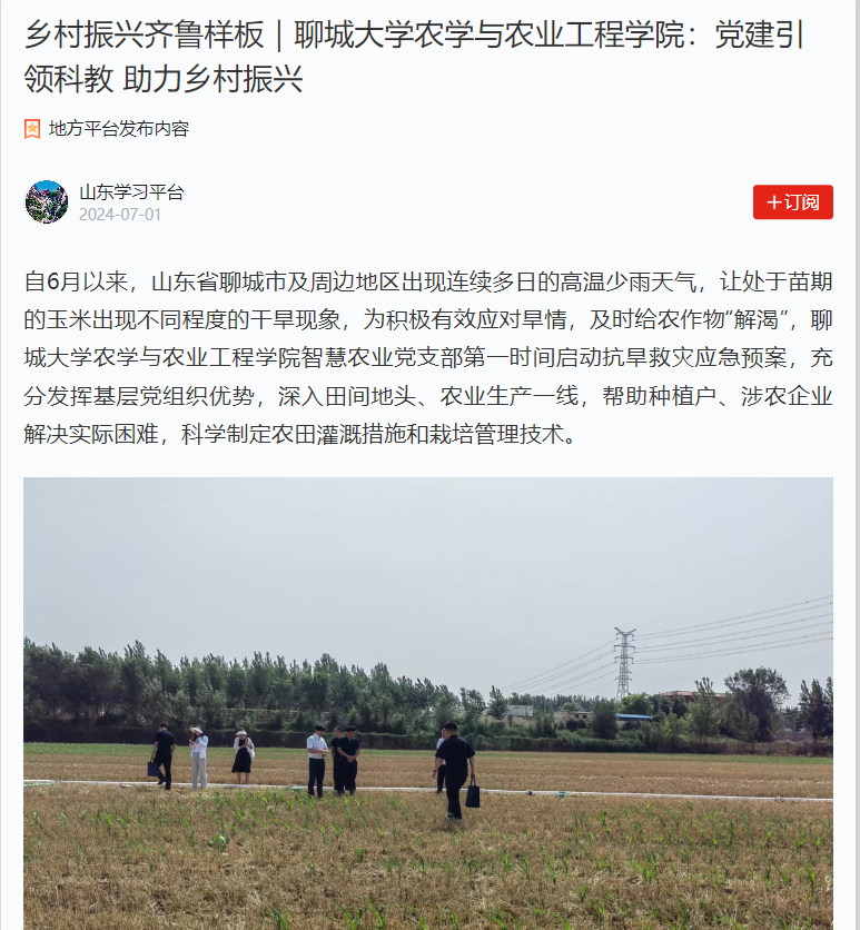 【編者按】7月1日,【學習強國】以《鄉(xiāng)村振興齊魯樣板|聊城大學農學與農業(yè)工程學院:黨建引領科教 助力鄉(xiāng)村振興》為題,報道農學與農業(yè)工程學院智慧農業(yè)黨支部針對干旱天氣,開展抗旱救災應急預案,展現(xiàn)了基層黨組織的優(yōu)勢,為鄉(xiāng)村振興貢獻力量。