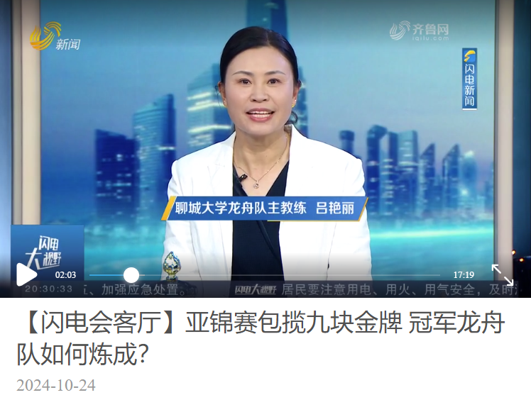 10月24日,我校龍舟隊(duì)主教練呂艷麗應(yīng)邀做客山東衛(wèi)視新聞?lì)l道的直播欄目“閃電大視野”,在“閃電會(huì)客廳”版塊接受采訪,動(dòng)情講述了龍舟隊(duì)在第十五屆亞洲龍舟錦標(biāo)賽中頑強(qiáng)拼搏、奮勇爭(zhēng)先,最終包攬9塊金牌的經(jīng)過,回顧了龍舟隊(duì)22年來的成長(zhǎng)歷史、積累的寶貴經(jīng)驗(yàn),并對(duì)龍舟隊(duì)的未來進(jìn)行了展望。節(jié)目在閃電新聞客戶端、閃電新聞官網(wǎng)同步直播,社會(huì)反響熱烈。