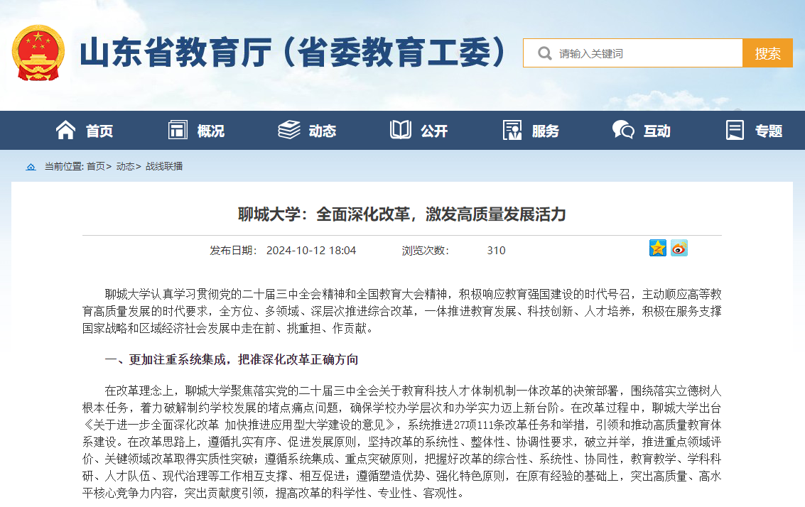 【編者按】10月12日,山東省教育廳(省委教育工委)以《聊城大學:全面深化改革,激發(fā)高質(zhì)量發(fā)展活力》為題,報道了我校深入推進綜合改革,在教育發(fā)展、科技創(chuàng)新、人才培養(yǎng)、服務(wù)社會等方面的先進作法和經(jīng)驗。