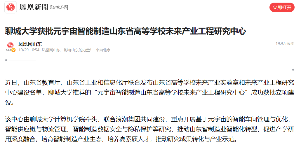 【編者按】10月29日,鳳凰網報道了聊城大學獲批元宇宙智能制造山東省高等學校未來產業工程研究中心的消息。
