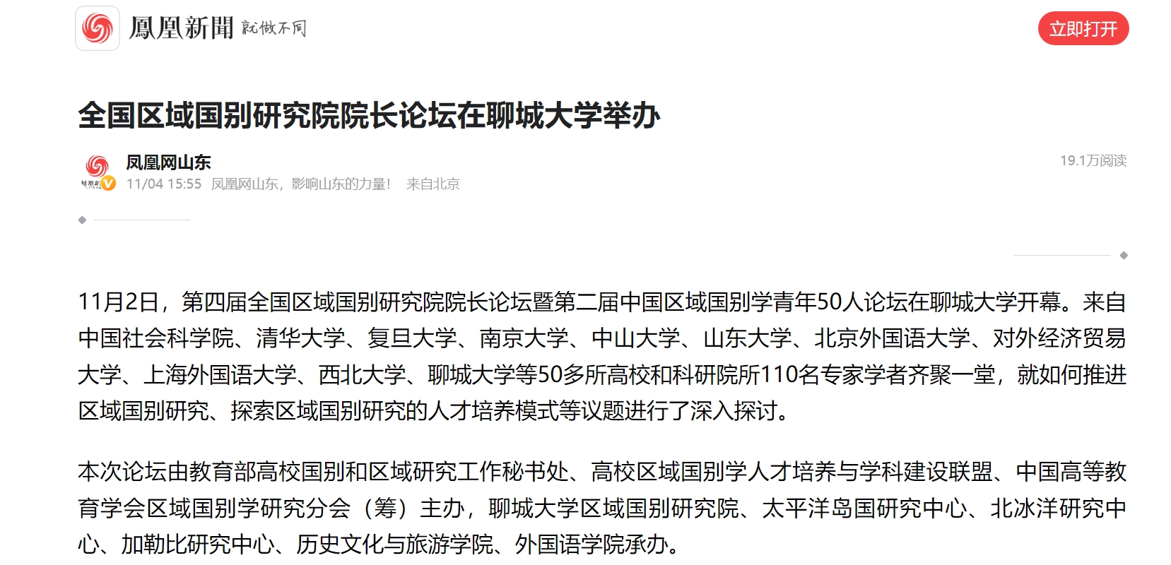 【鳳凰網】【大眾網? 海報新聞】報道:全國區域國別研究院院長論壇在聊城大學舉辦