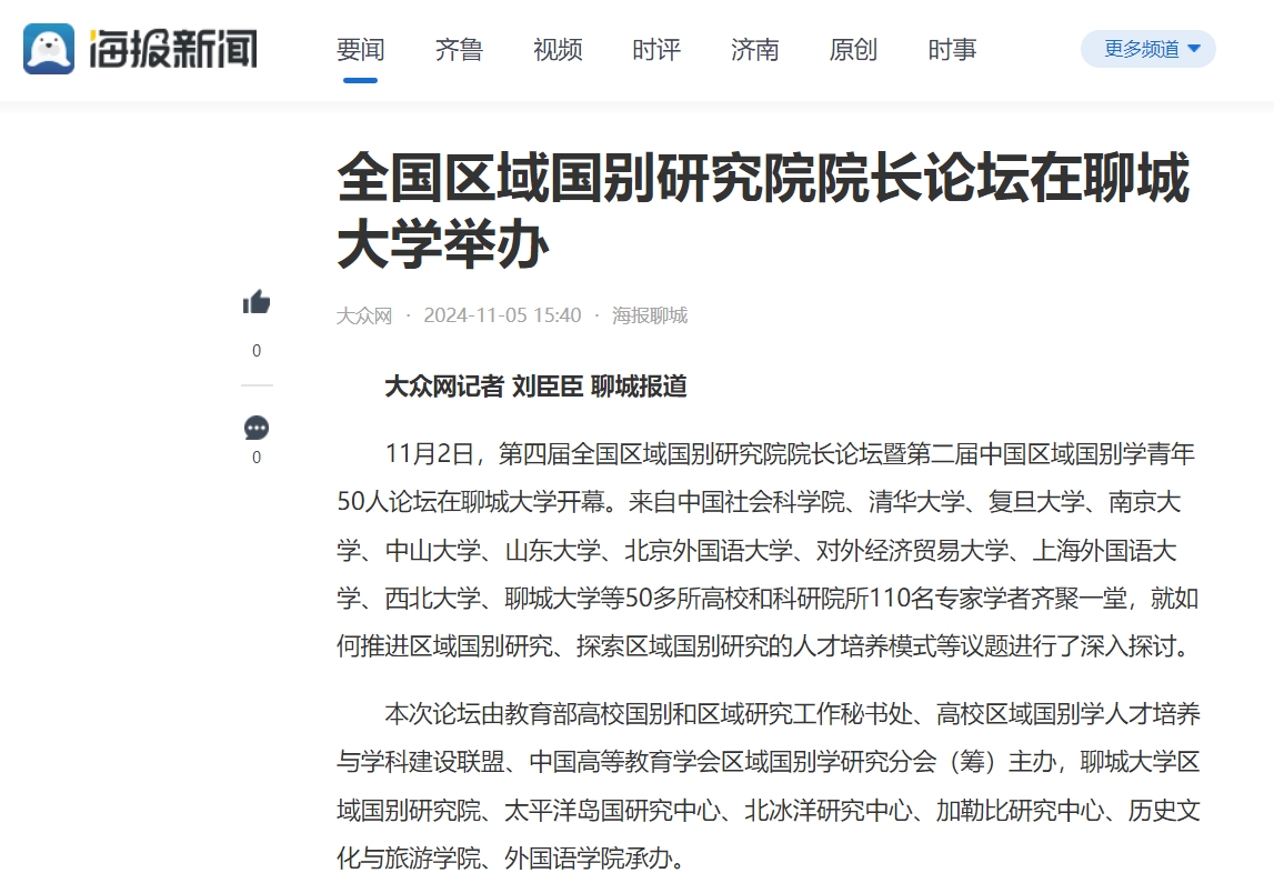 【編者按】11月4日、5日,鳳凰網和大眾網? 海報新聞分別報道了全國區域國別研究院院長論壇在聊城大學舉辦的消息。