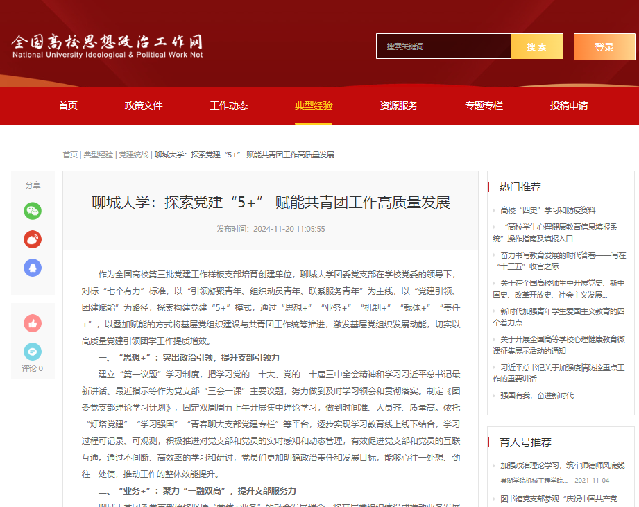 【編者按】11月20日,全國(guó)高校思想政治工作網(wǎng)以《聊城大學(xué):探索黨建“5+” 賦能共青團(tuán)工作高質(zhì)量發(fā)展》為題在典型經(jīng)驗(yàn)專欄報(bào)道了我校團(tuán)委黨支部探索構(gòu)建黨建“5+”模式,推動(dòng)黨建與業(yè)務(wù)工作互融互促的全國(guó)樣板黨支部建設(shè)經(jīng)驗(yàn)。