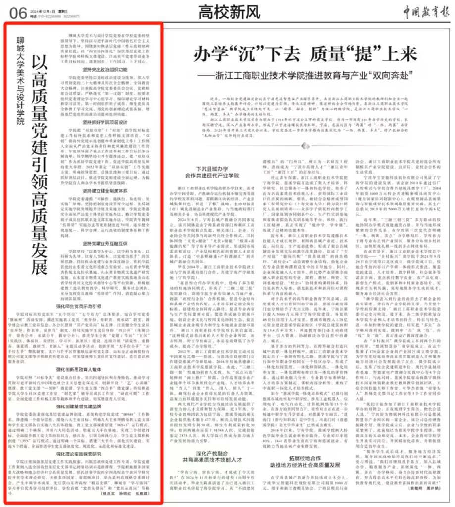 【編者按】12月4日,《中國(guó)教育報(bào)》第六版刊發(fā)我校美術(shù)與設(shè)計(jì)學(xué)院黨建工作文章《聊城大學(xué)美術(shù)與設(shè)計(jì)學(xué)院以高質(zhì)量黨建引領(lǐng)高質(zhì)量發(fā)展》。文章總結(jié)了美術(shù)與設(shè)計(jì)學(xué)院黨委在學(xué)校黨委的堅(jiān)強(qiáng)領(lǐng)導(dǎo)下,堅(jiān)持以習(xí)近平新時(shí)代中國(guó)特色社會(huì)主義思想為指導(dǎo),圍繞新時(shí)期基層黨建工作示范創(chuàng)建和質(zhì)量創(chuàng)優(yōu),以高水平黨建帶動(dòng)業(yè)務(wù)工作目標(biāo)同向、部署同步、工作同力、上下同心的實(shí)踐經(jīng)驗(yàn)。文中談到,美術(shù)與設(shè)計(jì)學(xué)院黨委以“四堅(jiān)持四強(qiáng)化”加快基層黨建工作標(biāo)桿學(xué)院和樣板支部建設(shè),即堅(jiān)持突出政治組織功能、堅(jiān)持抓好學(xué)院頂層設(shè)計(jì)、堅(jiān)持建立健全制度體系、堅(jiān)持黨建業(yè)務(wù)互融互促,強(qiáng)化師生黨員示范引領(lǐng)、強(qiáng)化創(chuàng)新思政育人載體、強(qiáng)化創(chuàng)建基層黨建品牌、強(qiáng)化理論實(shí)踐探索研究,不斷增強(qiáng)基層黨組織政治功能和組織功能,切實(shí)推動(dòng)高校基層黨建工作提質(zhì)增效,有效實(shí)現(xiàn)學(xué)院黨的建設(shè)和業(yè)務(wù)工作共同發(fā)展。