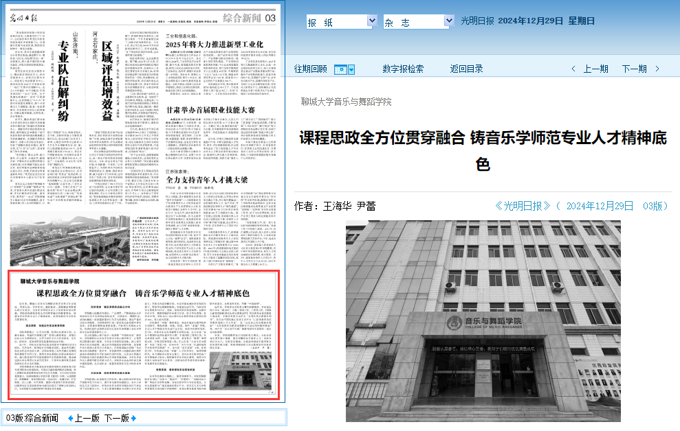 【編者按】12月29日,《光明日報》第三版以《課程思政全方位貫穿融合 鑄音樂學師范專業人才精神底色》為題,報道了聊城大學音樂與舞蹈學院堅持課程思政全方位貫穿融合的教育理念,鑄就音樂學師范專業人才精神底色的做法。
