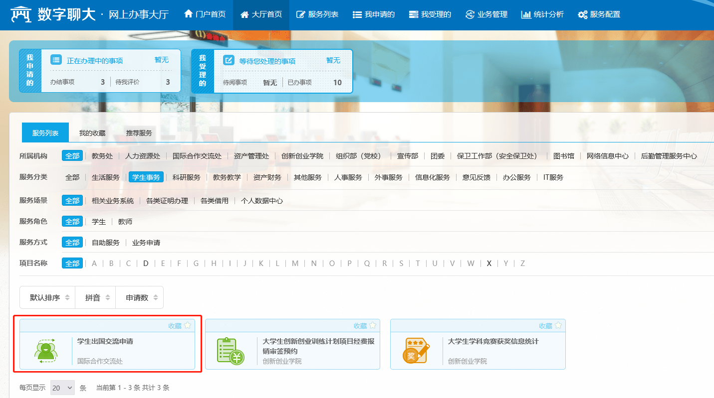 為方便需要出國(guó)交流的學(xué)生遞交出國(guó)交流申請(qǐng),國(guó)際合作交流處在辦事大廳上線“學(xué)生出國(guó)交流申請(qǐng)”,有此需求的學(xué)生可通過(guò) “辦事大廳-學(xué)生出國(guó)交流申請(qǐng)”進(jìn)行申請(qǐng)。