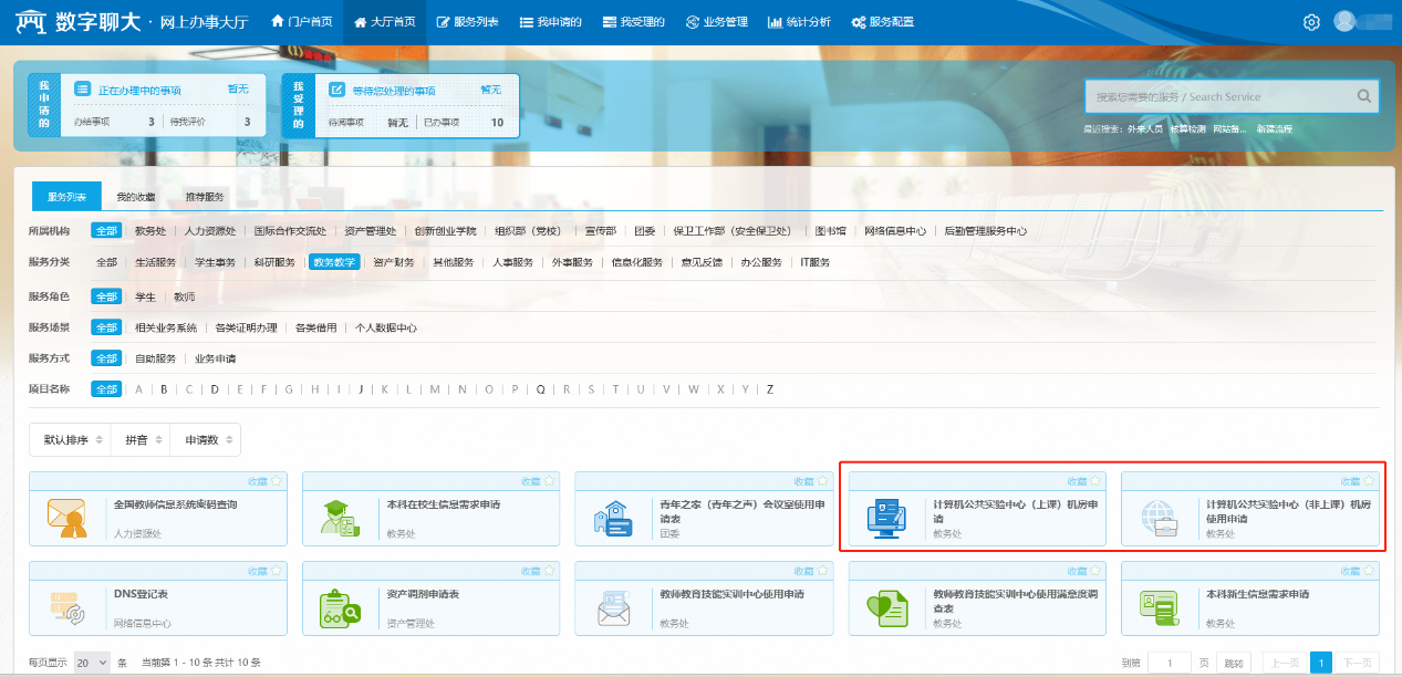 為方便大家預(yù)約使用計(jì)算機(jī)公共實(shí)驗(yàn)中心機(jī)房資源,教務(wù)處在辦事大廳上線“計(jì)算機(jī)公共實(shí)驗(yàn)中心機(jī)房申請(qǐng)”流程,可通過(guò)“辦事大廳-計(jì)算機(jī)公共實(shí)驗(yàn)中心機(jī)房申請(qǐng)”進(jìn)行申請(qǐng),機(jī)房使用申請(qǐng)需經(jīng)教務(wù)處等主管部門(mén)審批通過(guò)后,方可使用。