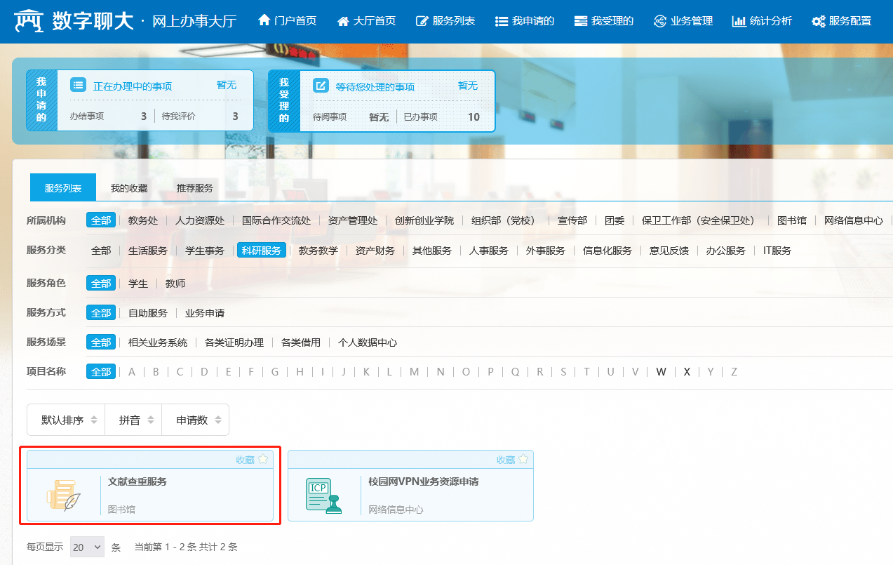 為方便校內(nèi)師生進(jìn)行文獻(xiàn)查重,圖書(shū)館在辦事大廳上線“文獻(xiàn)查重服務(wù)”流程,有此需求的師生可通過(guò) “辦事大廳-文獻(xiàn)查重服務(wù)”進(jìn)行申請(qǐng),并仔細(xì)閱讀申請(qǐng)頁(yè)面的辦理說(shuō)明。