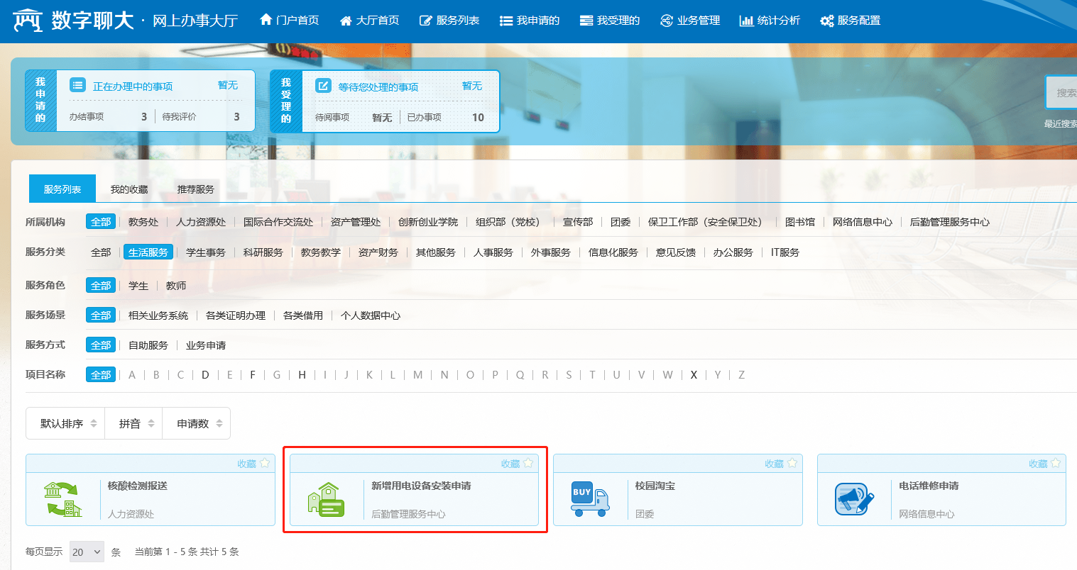 為方便校內(nèi)各單位用電設(shè)備,后勤管理服務(wù)中心在辦事大廳上線“新增用電設(shè)備安裝申請(qǐng)”流程,可通過(guò)“辦事大廳-新增用電設(shè)備安裝申請(qǐng)”進(jìn)行申請(qǐng),經(jīng)后勤管理服務(wù)中心審批通過(guò)后,可安裝使用。