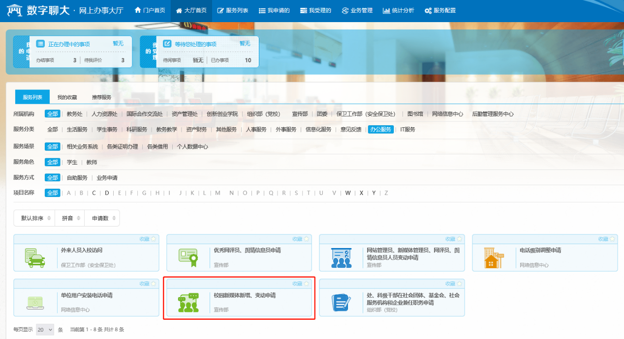 為方便校內(nèi)各單位進(jìn)行新媒體新增及變動(dòng),宣傳部在網(wǎng)上辦事大廳上線“校園新媒體新增、變動(dòng)申請(qǐng)”業(yè)務(wù)流程,有此需求的單位可通過(guò) “辦事大廳-校園新媒體新增、變動(dòng)申請(qǐng)”進(jìn)行申請(qǐng)。