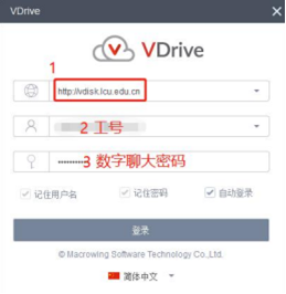 (5)雙擊圖標進入客戶端,輸入網盤地址(http://vdisk.lcu.edu.cn)、工號和數字聊大密碼。可勾選自動登錄,實現開機自動登錄網盤。