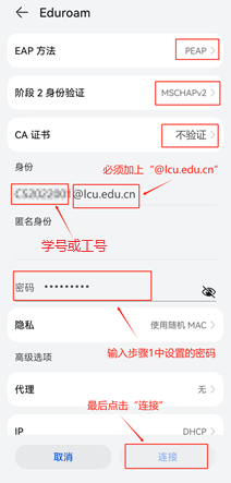 7.點擊“連接”,登錄“Eduroam”的網絡,即可訪問網絡資源。手機自動記憶以上設置信息,下一次連接“Eduroam”網絡,系統會自動登錄連接網絡,無需重復設置輸入身份和密碼。