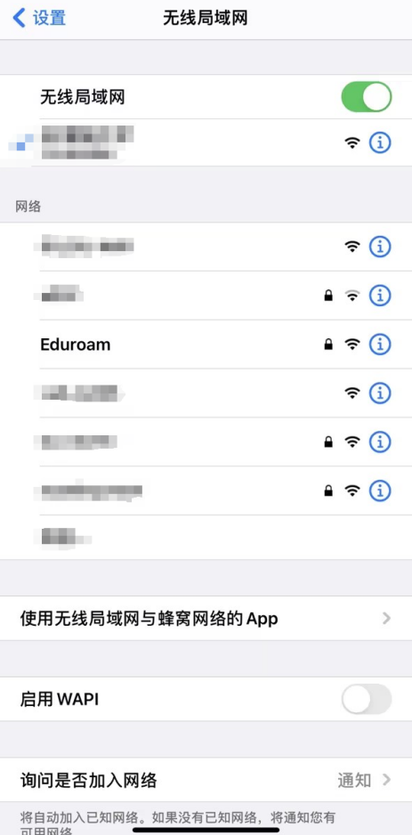1.打開“無線局域網”,點擊名為“Eduroam”的網絡,進入登陸設置界面;