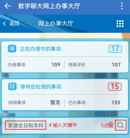 方式二:打開瀏覽器,進入數字聊大,在頁面頂部導航欄,點擊“辦事大廳”,后續步驟參照以上操作即可。