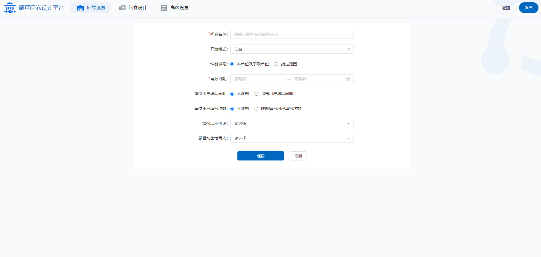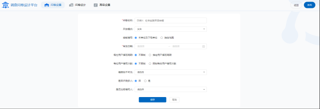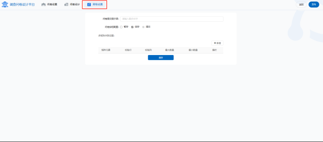 問卷設(shè)置功能依據(jù)不同類別的管理員賬號(hào),呈現(xiàn)出不同的設(shè)置內(nèi)容。問卷發(fā)布員點(diǎn)擊創(chuàng)建問卷后,會(huì)進(jìn)入問卷設(shè)置的界面,如圖2所示。