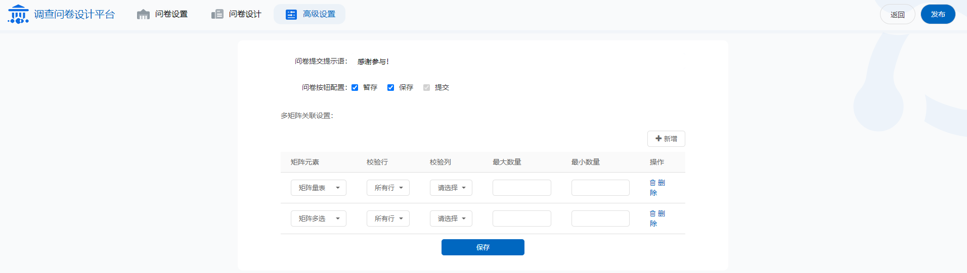 問卷設(shè)計(jì)完成后,對(duì)問卷進(jìn)行高級(jí)設(shè)置,包括問卷提交提示語(yǔ)、問卷按鈕配置和多矩陣關(guān)聯(lián)設(shè)置,如圖4所示。