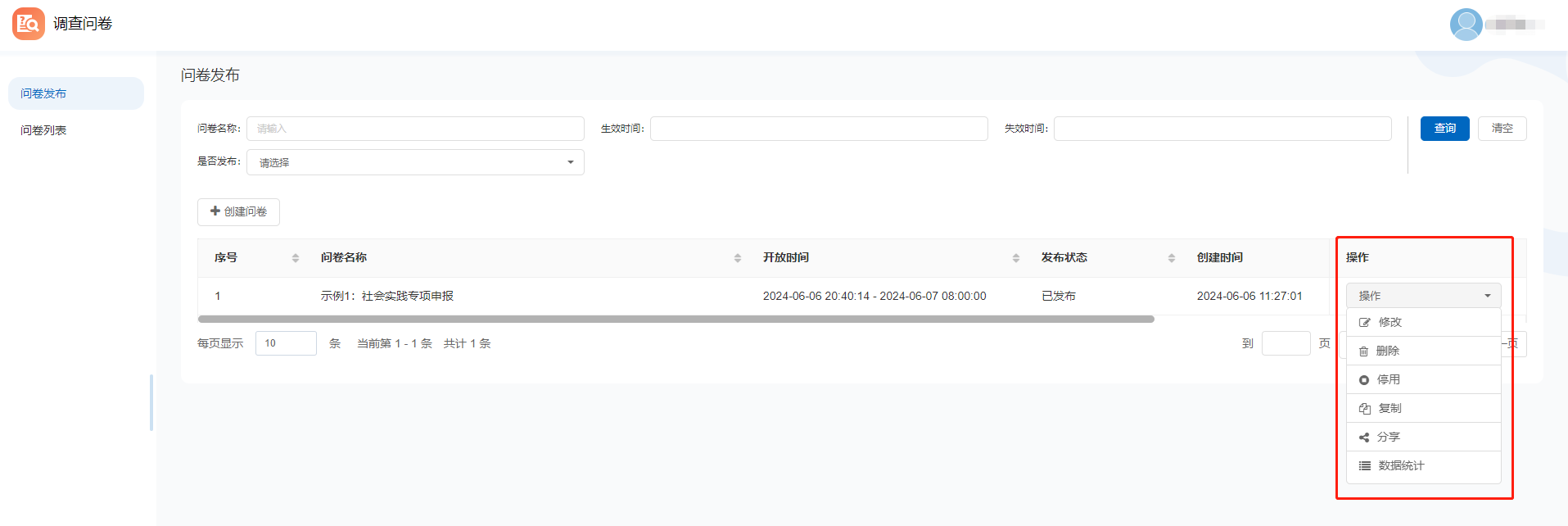 ●修改:可重新對(duì)當(dāng)前問卷進(jìn)行調(diào)整修改并及時(shí)保存,修改完成后需重新進(jìn)行問卷發(fā)布。