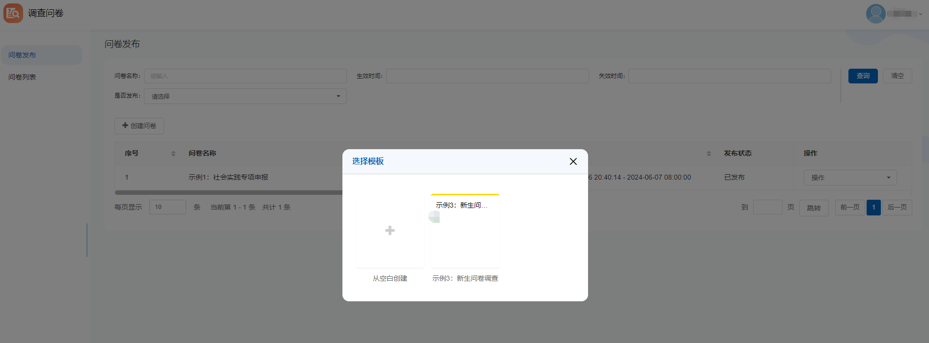 2.選擇問卷模板。選擇已經(jīng)制作好的問卷模板示例或者從空白創(chuàng)建新的問卷,如圖11所示。