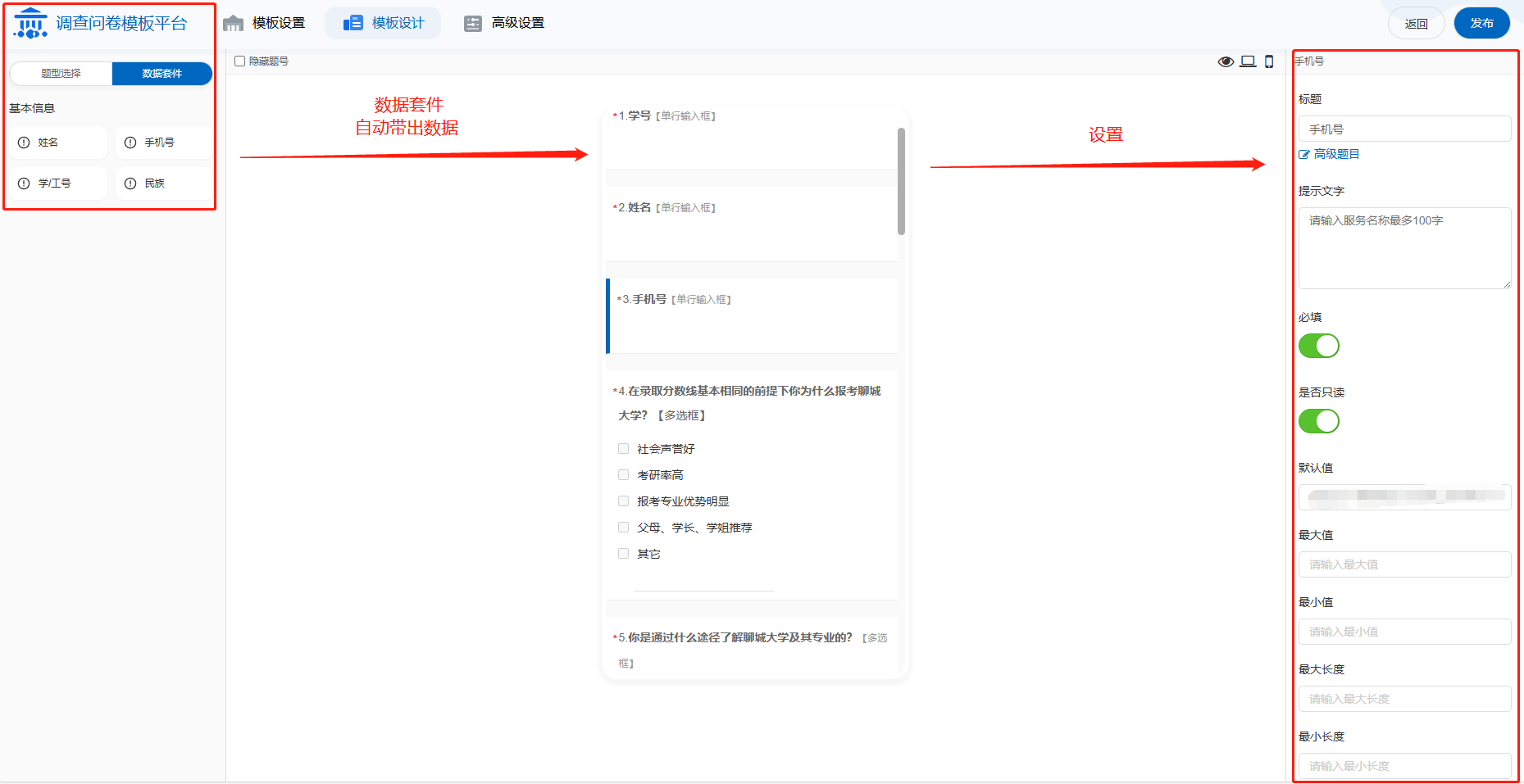 ●數(shù)據(jù)套件:可將數(shù)據(jù)自動(dòng)帶出,目前支持的字段為姓名、手機(jī)號(hào)、學(xué)/工號(hào)和民族。
