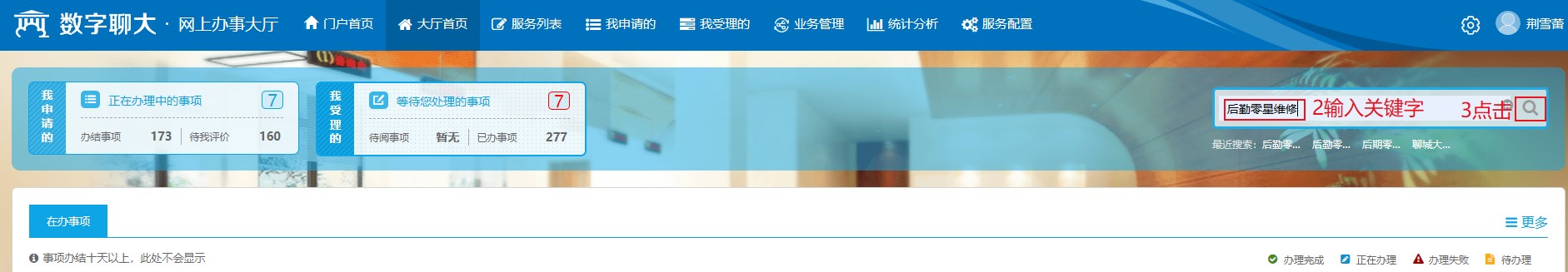 方式一:打開瀏覽器,進入數字聊大,在頁面頂部導航欄,點擊“辦事大廳”,具體步驟參照以下操作即可。