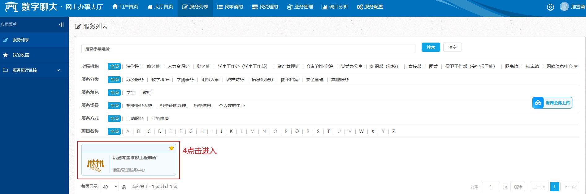 為進一步推進信息化賦能管理服務職能,通過線上流轉替代傳統紙質審核,縮短審核周期,實現“數據多跑路,師生少跑腿”,提高審核效率。網絡信息中心聯合后勤管理服務中心依托“數字聊大”平臺開發完成了“后勤零星維修工程申請”網上辦事流程。