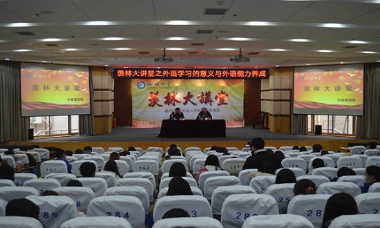12月17日,由學生工作處主辦、外國語學院承辦的第71期“羨林大講堂”于西校區圖書館大報告廳舉辦。聊城大學特聘課程教授韓水軍應邀作了題為《外語學習的意義與外語能力養成》的報告。報告會由外國語學院副院長李維濱主持,外國語學院師生200余人聆聽了報告。