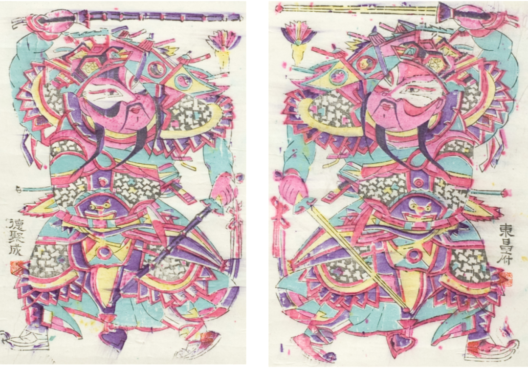 張憲昌動情地講述了自己受父輩熏陶接觸民間傳統藝術及與東昌府木刻年畫結緣的過程。他還通過被孫愛國先生稱為“中國門神之最”的一對門神紙碼,及民間俗稱為“韓湘子花籃”的年畫,以及“灶君”、扇面等實例,闡釋了東昌府年畫所獨有的造型生動傳神、運動感強、構圖飽滿、造型圓中見方及對物象結構進行概括、夸張、強化的藝術特點。他強調了刻版藝人對于東昌府年畫藝術成就的重要性,正是因為這些藝人的高超技藝,使東昌府年畫在中國眾多年畫流派中取得一席之地。他介紹了目前東昌府傳統民間年畫的保護情況,表達了“后傳統文化熱潮”時代對東昌府年畫保護與研究的憂慮。