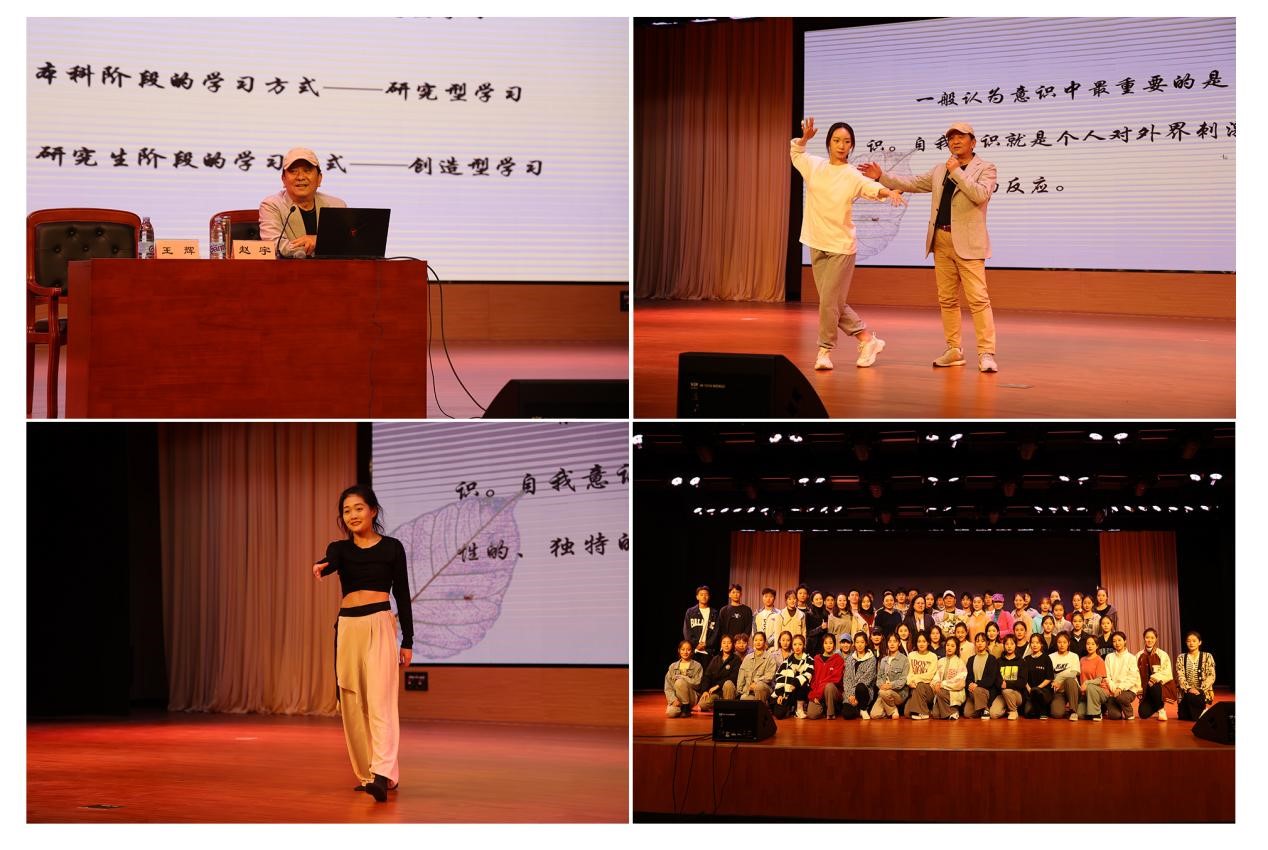 趙宇圍繞主題從“道”與學習方式的釋解、舞蹈肢體的運動原理、舞蹈意識的養成、舞蹈肢體語言的語氣應用、選材中可舞性的認定、以文化舞,文舞相容六個方面進行生動全面地講解。他從人體肌肉骨骼構成談起并指出,舞蹈一定是經過不斷的訓練形成肌肉記憶才能完成的技巧,所以,刻苦的訓練才是優秀舞蹈演員、學生的必由之路,沒有捷徑可走。他與現場舞蹈系同學配合,通過講、演結合的方式全面地演示了舞蹈意識的養成、舞蹈的肢體語言、舞蹈的創作等問題,深入淺出、靈活生動,讓在場舞蹈藝術愛好者深切感受到細膩的肢體語言所散發出的魅力。
