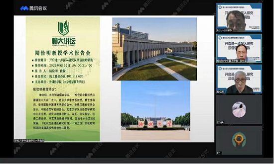 5月16日,北京大學中文系教授、博士生導師陸儉明應邀做客線上聊大講壇,通過視頻會議作了題為《開啟進一步深入研究漢語語法的鑰匙》的學術報告。報告會由外國語學院主辦,吸引了相關領域的專家學者1000余人參加。外國語學院副院長李維濱主持報告會。