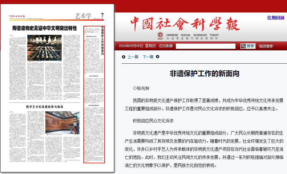 9月5日,《中國社會科學報》總第2971期第7版刊發我校美術與設計學院院長、黃河學研究院執行院長張兆林同志題為《非遺保護工作的新面向》的理論文章。