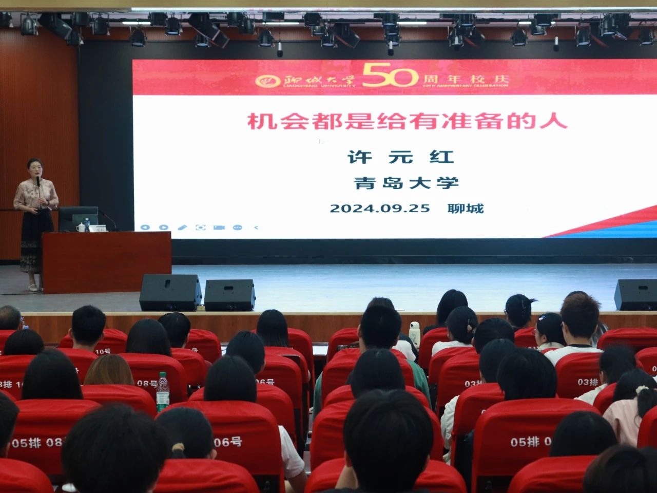 許元紅以聊城大學(xué)校友的身份回憶了在母校的青春歲月,并結(jié)合自身經(jīng)歷向?qū)W生講述了自己不懈努力抓住機會的成長故事。她強調(diào),機會總是青睞那些有準備的人,這里的“準備”,不僅僅是知識和技能的儲備,更是心態(tài)和行動上的全面就緒。她談到,科研工作者需要具備敏銳的洞察力,能夠及時捕捉到學(xué)科前沿的動態(tài)和潛在的研究機會;同時,還要具備扎實的專業(yè)功底和不懈的探索精神,能夠在復(fù)雜多變的研究環(huán)境中保持定力,持續(xù)深耕。她希望青年學(xué)子能夠不斷提高自身思想覺悟,真正做到自強不自負,自信不自卑。她對同學(xué)們提出“知行合一、篤定堅持、向上向善、守正創(chuàng)新”十六個字的殷切期望,同樣也是對同學(xué)們未來學(xué)習(xí)生活的全面指導(dǎo)。
