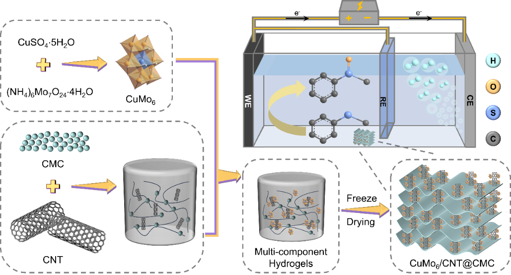 電化學合成高附加值化學品在推動綠色化工和可持續發展方面具有重要地位,可為實現國家“雙碳”戰略目標提供技術支撐。亞砜為一種用途廣泛的有機硫化物,在藥物化學、材料科學和天然產物合成中應用廣泛。迄今為止,在硫化物的氧化反應中通常用到O2、H2O2、間氯過氧苯甲酸、CrO3、NaIO4和KMnO4等氧化劑。然而,這些策略仍然面臨著諸多障礙,團隊成員設計了一種多鉬氧簇氣凝膠電催化劑的合成方案,通過碳納米管調節多鉬氧和泡沫之間的微環境,極大地提高了復合催化劑的電催化活性,實現了有機硫化物的高效選擇性氧化。