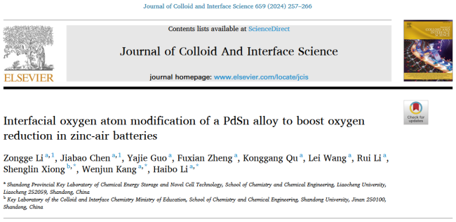近日,我校化學化工學院李海波教授及其團隊的論文《界面氧原子修飾PdSn合金以促進鋅空氣電池中的氧還原反應》(Interfacial oxygen atom modification of a PdSn alloy to boost oxygen reduction in zinc-air batteries)在《膠體與界面科學》(Journal of Colloid and Interface Science)期刊第659期發表。該期刊是Elsevier旗下化學領域的老牌期刊(2023年影響因子/中科院分區:9.9/一區),致力于先進材料、納米醫學、能源環境技術、催化和相關領域的新應用等創新和高影響力的研究,具有全球影響力。
