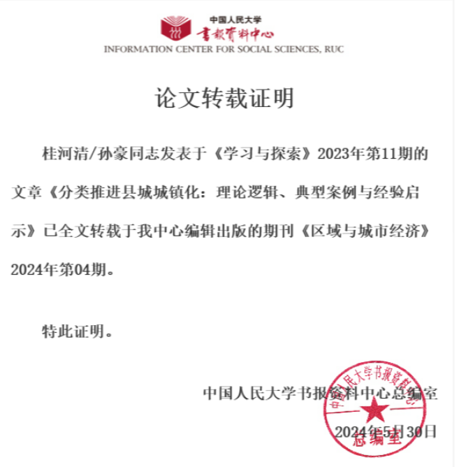 近日,商學院教師桂河清發表在《學習與探索》2023年第11期上的一作論文《分類推進縣城城鎮化:理論邏輯、典型案例與經驗啟示》被人大復印《區域與城市經濟》2024年04期全文轉載。