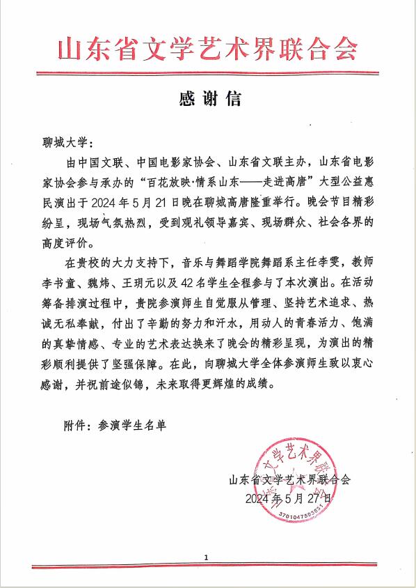 5月27日,山東省文學藝術界聯合會向聊城大學發來感謝信,感謝我校音樂與舞蹈學院舞蹈系46位師生參加了中國文聯、中國電影家協會、山東省文聯主辦的大型公益惠民演出。在感謝信中,山東文聯充分贊揚了舞蹈系師生對藝術的追求、專業的藝術表達以及他們動人的青春活力、飽滿的真摯情感,感謝他們的精彩呈現,為演出的精彩順利提供堅強保障。