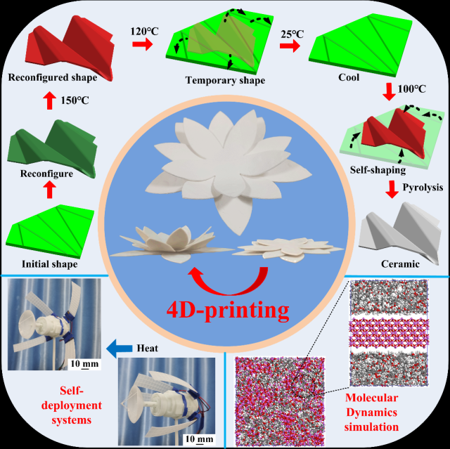 聚合物衍生陶瓷(PDCs)由于其高熱穩(wěn)定性、抗氧化性和耐腐蝕性,在制造復(fù)雜形狀的陶瓷零件方面受到了廣泛的關(guān)注。雖然柔性PDCs提供結(jié)構(gòu)重構(gòu),但誘導(dǎo)形狀變化的方法主要依賴于機(jī)械負(fù)載,如手動(dòng)加載、電機(jī)或氣動(dòng)泵,這被認(rèn)為是不切實(shí)際的,并且需要復(fù)雜的控制系統(tǒng)。為了解決這些問(wèn)題,團(tuán)隊(duì)首次提出并開(kāi)發(fā)了一種基于還原光聚合(VPP)的四維(4D)打印方法,以制造具有可重構(gòu)和形狀記憶效應(yīng)的PDCs。這種創(chuàng)新的4D打印方法是高度可編程的,并與VPP技術(shù)兼容,允許制造高分辨率,復(fù)雜設(shè)計(jì)的陶瓷結(jié)構(gòu)。通過(guò)兩步固化工藝,成功地實(shí)現(xiàn)了聚合物衍生陶瓷前驅(qū)體(PDCPs)的自主形狀轉(zhuǎn)變。采用有限元建模和分子動(dòng)力學(xué)模擬相結(jié)合的方法對(duì)形狀變化進(jìn)行預(yù)測(cè)和控制。基于所提出的方法,成功地制造了自展開(kāi)系統(tǒng)(如空間站太陽(yáng)能電池板的智能鉸鏈),證明了PDCPs在智能制造、航空航天、生物醫(yī)學(xué)等領(lǐng)域的潛在應(yīng)用。